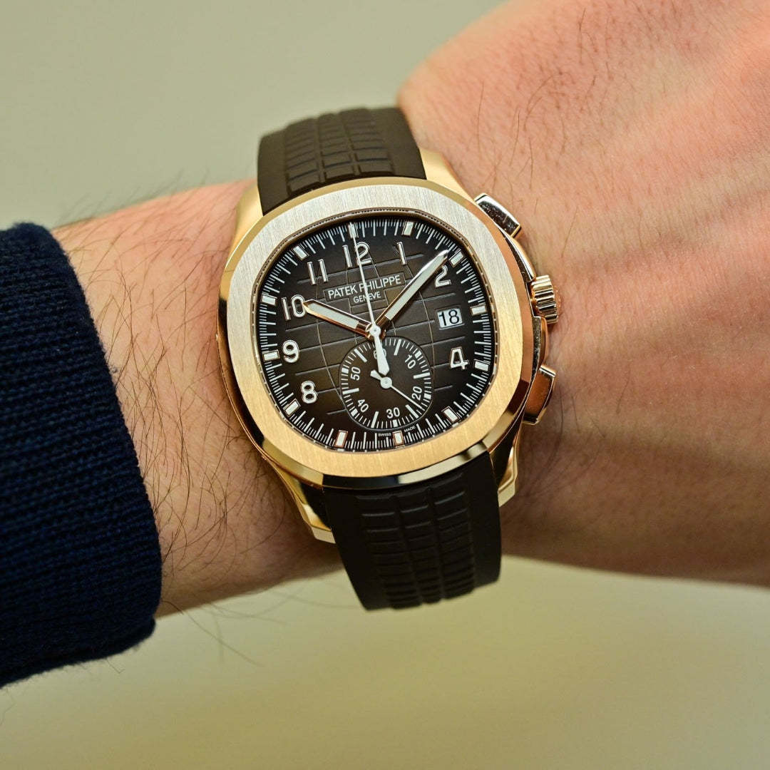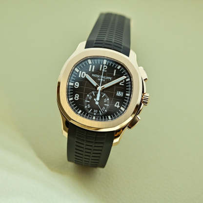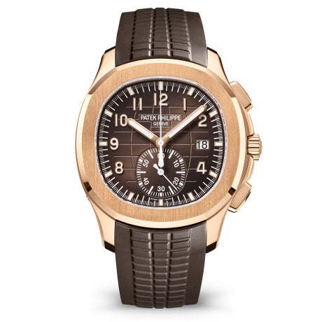 WATCHSelf-winding mechanical movement.Caliber CH 28‑520 C.Flyback chronograph.Central chronograph hand.60-minute counter.Date in an aperture. DIALSunburst brown with black-gradient rim. embossed with Aquanaut pattern. gold applied numerals with white luminescent coating. CASERose gold. Screw-down crown.Sapphire crystal case back.Water-resistant to 120 m.Diameter (10-4 o'clock): 42.2 mm. Height: 11.9 mm. STRAPComposite material. dark brown.Aquanaut fold-over clasp.